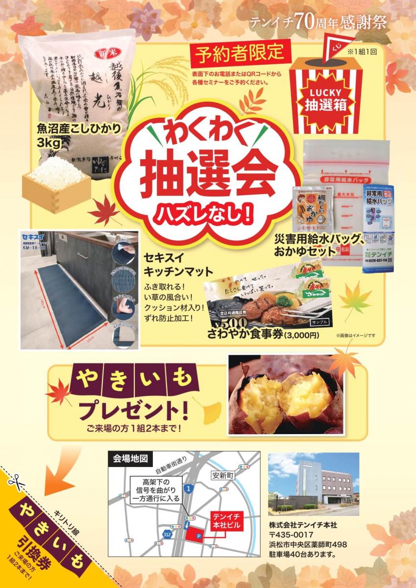 ご来場者には、魚沼産コシヒカリ3㎏や、さわやかお食事券3千円などが当たるハズレなしの抽選会を行うほか、焼き芋を1組2本までプレゼントします。